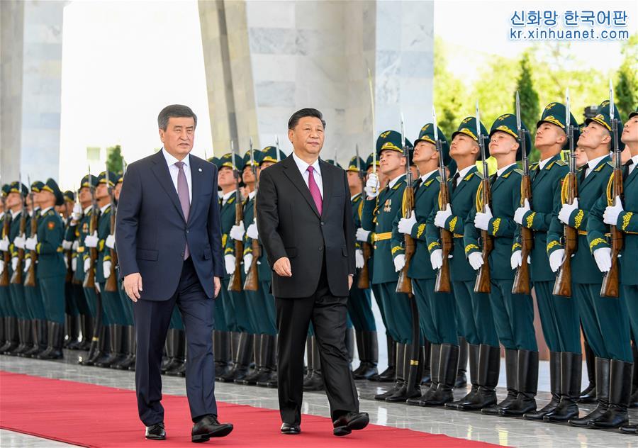 회담에 앞서, 제엔베코프 대통령이 비슈케크 국빈관 회의센터 앞 광장에서 시진핑 주석을 위해 성대한 환영식을 가졌다. 이는 양국 정상이 의장대를 사열하는 장면이다. [촬영/ 신화사 기자 가오제(高潔)]