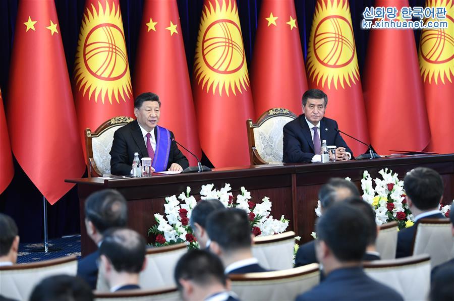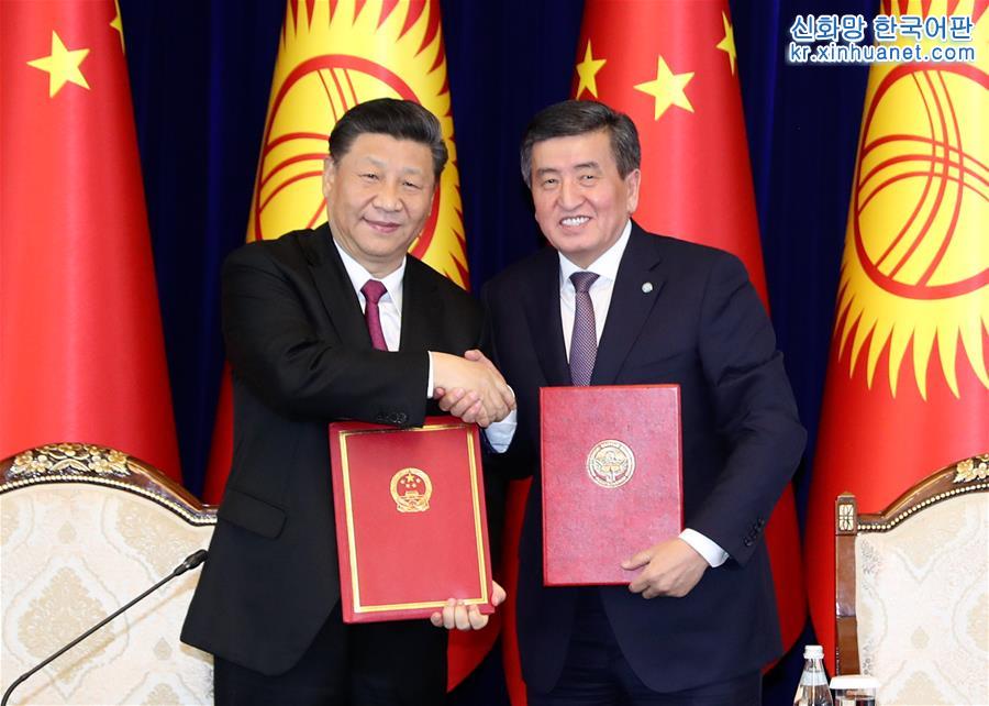 양국 정상이 회담을 마치고 ‘중화인민공화국과 키르기스스탄공화국이 전면적인 전략적 동반자 관계를 진일보 심화에 관한 공동성명’에 서명했다. [촬영/ 신화사 기자 페이마오화(費茂華)]
