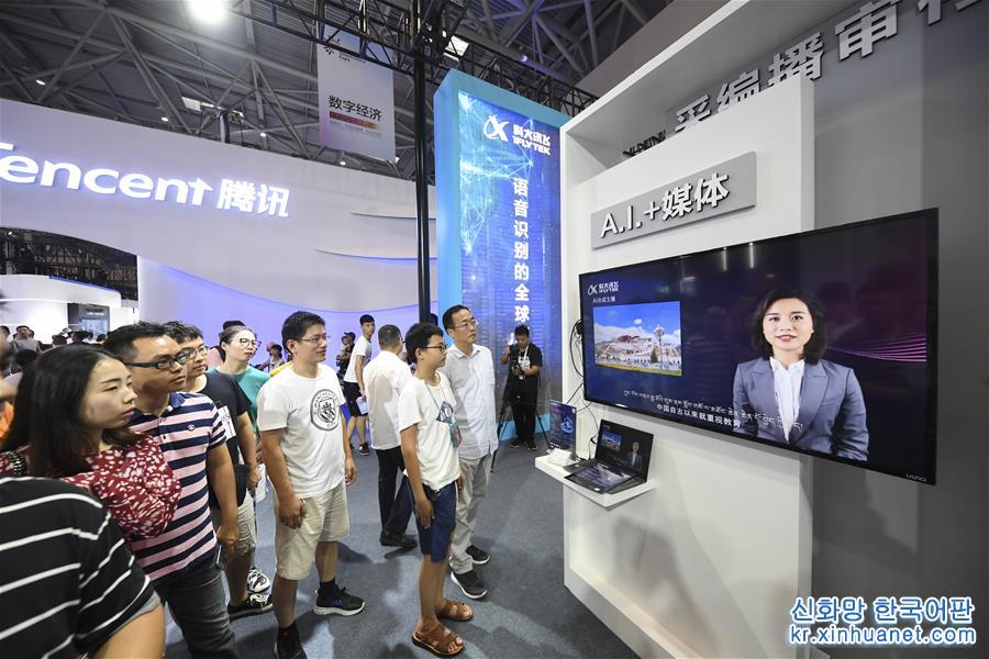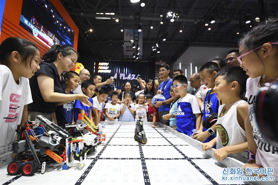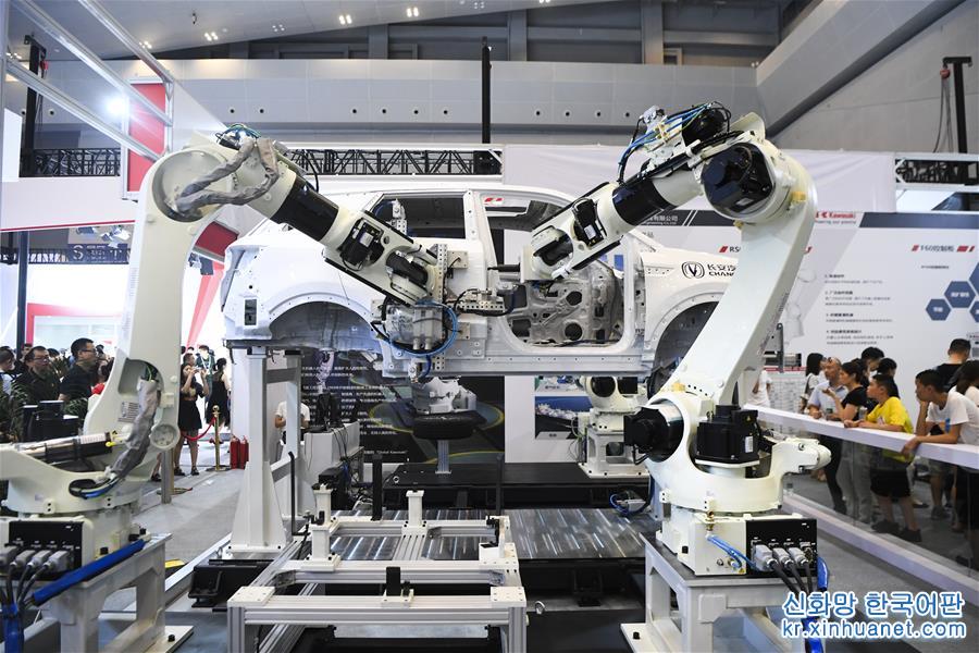 8월 27일, 관중이 스마트박람회에서 창안(長安)자동차의 지능형 자동차 생산라인을 참관하고 있다. 2019년 중국국제스마트산업박람회가 대중에게 오픈된 첫날인 이날, 수많은 시민과 유람객이 충칭(重慶) 국제컨벤션센터에 찾아와 ‘스마트응용’과 ‘스마트생활’을 몸소 체험했다. [촬영/ 신화사 기자 왕취안차오(王全超)]