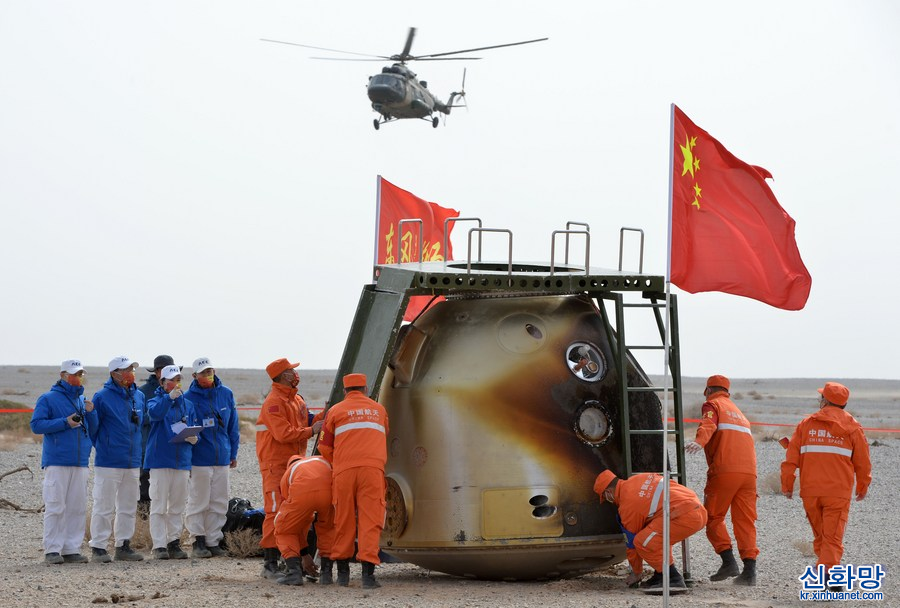 지난 16일 네이멍구(內蒙古)자치구 둥펑(東風)착륙장에 내려앉은 중국 유인우주선 선저우(神舟) 13호의 귀환 캡슐. (사진/신화통신)