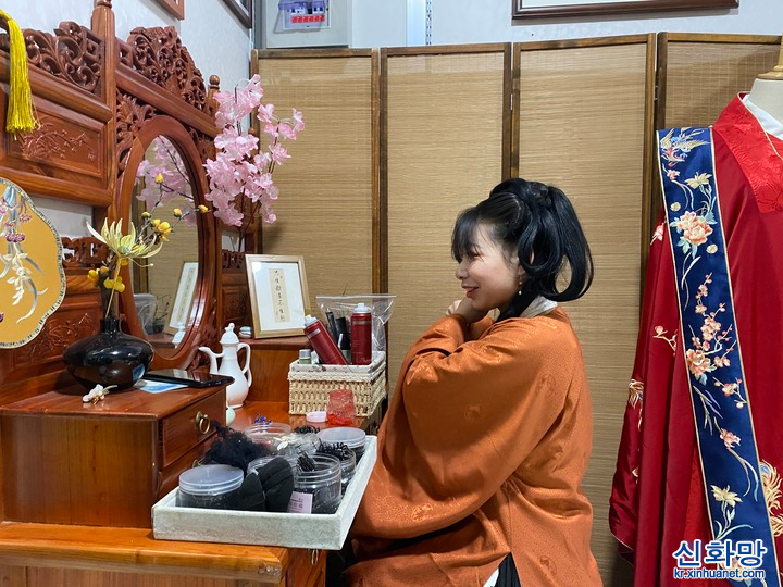 수추훙(舒秋紅) 사장이 자신이 경영하는 한푸(漢服) 전문점에서 화장을 하고 있다. (사진/신화통신)