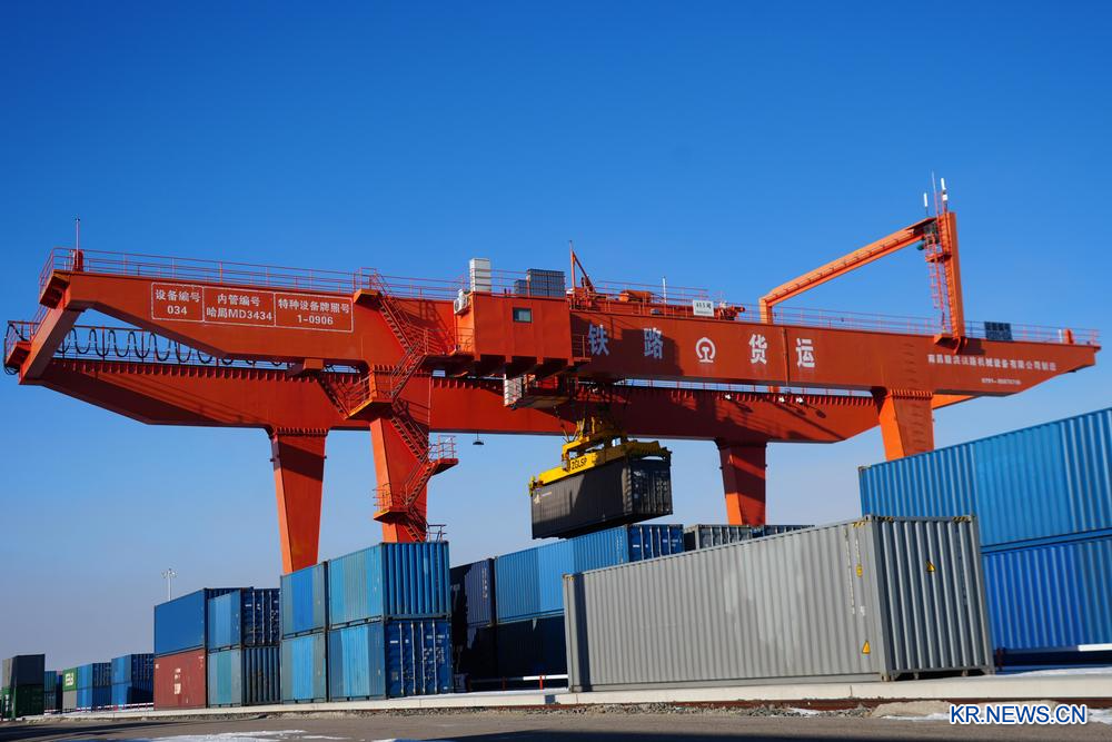 27일 중국철로 하얼빈(哈爾濱)국그룹 만저우리(滿洲里)역 국제 컨테이너 야적장에서 수입 컨테이너 환적 작업이 이루어지고 있다.